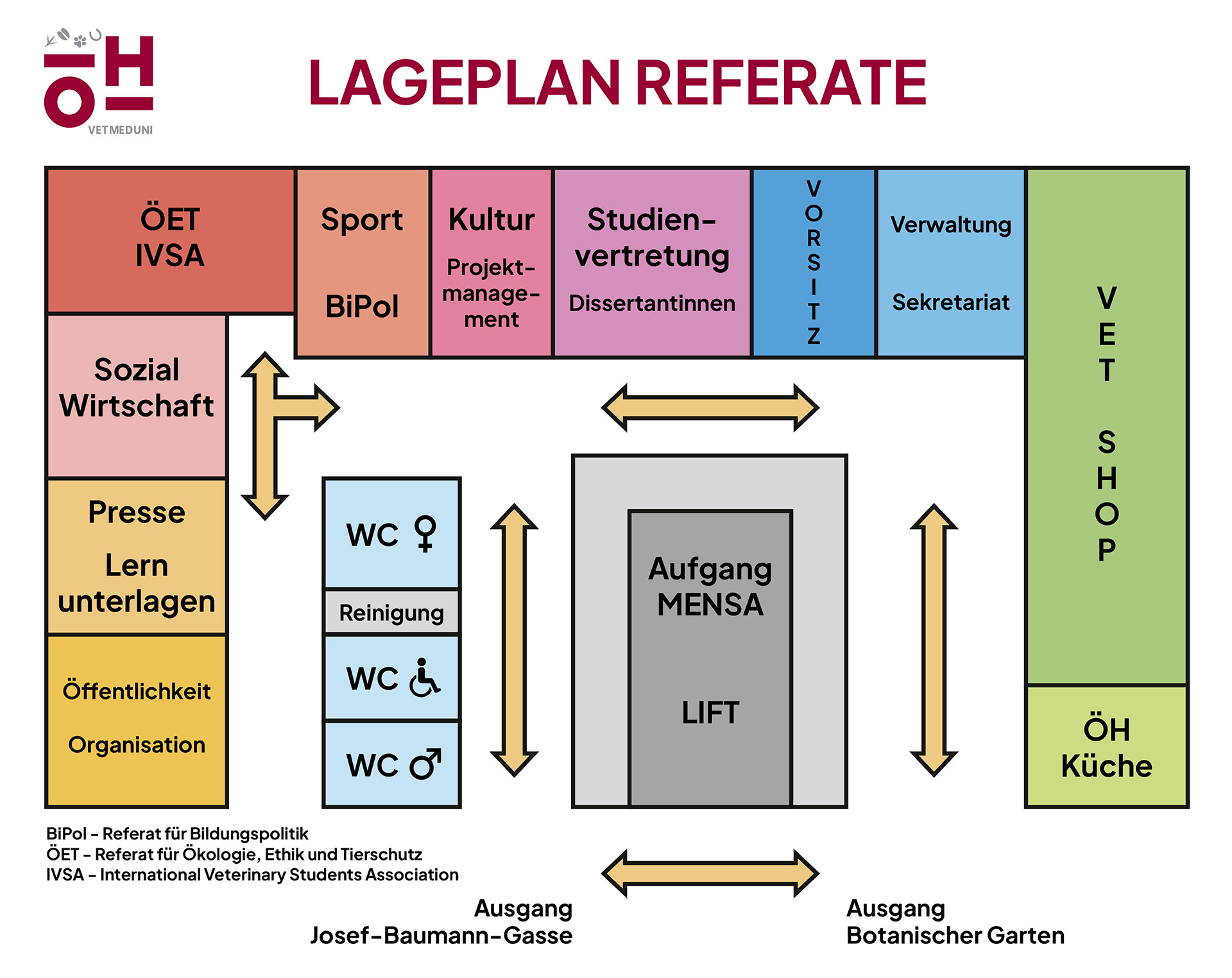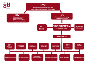 Die HVU besteht aus dem Vorsitz plus Verwaltung, 13 Referaten sowie dem VetShop. Zusätzlich gibt es die Studienvertretungen Veterinärmedizin und Biomedizin/IMHAI/Precision Animal Health.